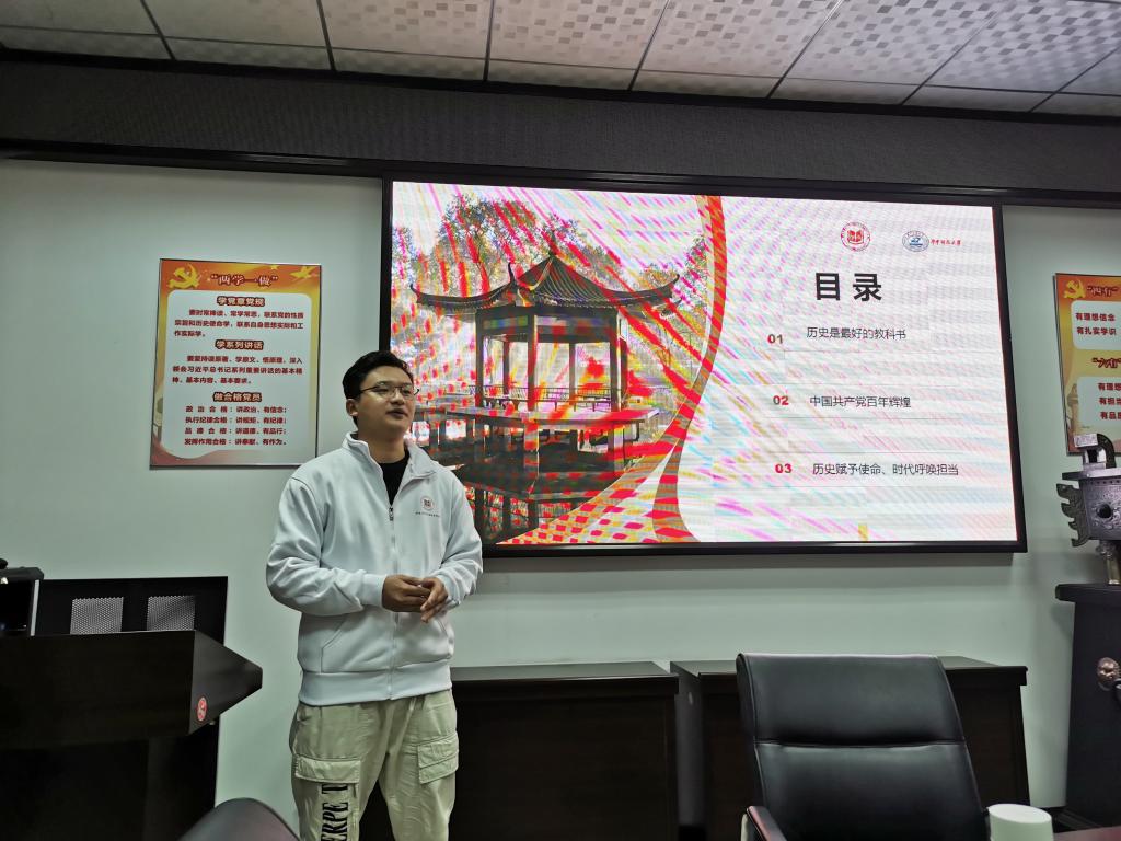 会上,校研究生红色理论学讲团讲师汪建辉同志做“感悟百年党史辉煌,凝聚青春奋进力量”的微党课教育。他分别从关于党史学习的“为什么学”、“学什么”、“怎么学”等方面讲述党史学习的必要性。