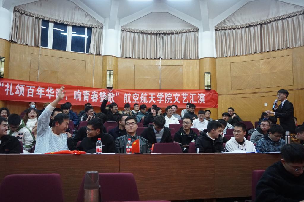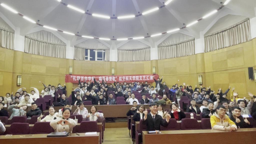 最后全场师生起身合唱《歌唱祖国》,激情洪亮的歌声久久回荡于礼堂上空。传承百年精神,凝聚奋进力量,通过活动覆盖全院学子,各党支部勠力同心,党员、团员积极参与,本次文艺汇演最终在一片热烈气氛中圆满落幕,航院学子也将恪守青年信念,勇担时代使命,传承弘扬“空天报国,力创未来”的航院精神,为下一个百年征程奉献青春力量!
