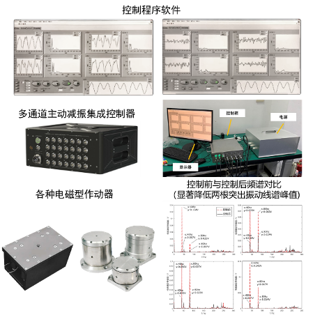 该系统采用国产化可编程嵌入式控制器件和作动机构,基于智能控制算法能同时抑制机械系统多个通道的耦合振动。经实验验证,主动减振能在被动减振的基础上进一步降低20 dB的低频振动,可应用于飞行器、舰船、陆上载具、精密仪器的振动噪声控制。