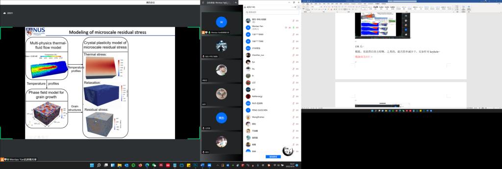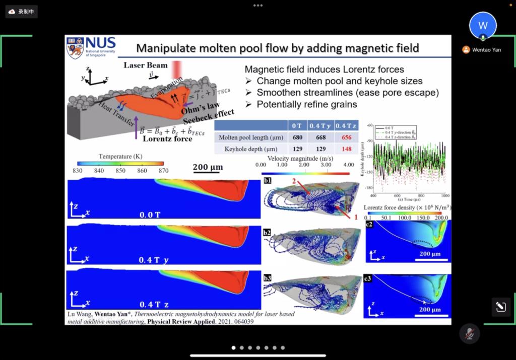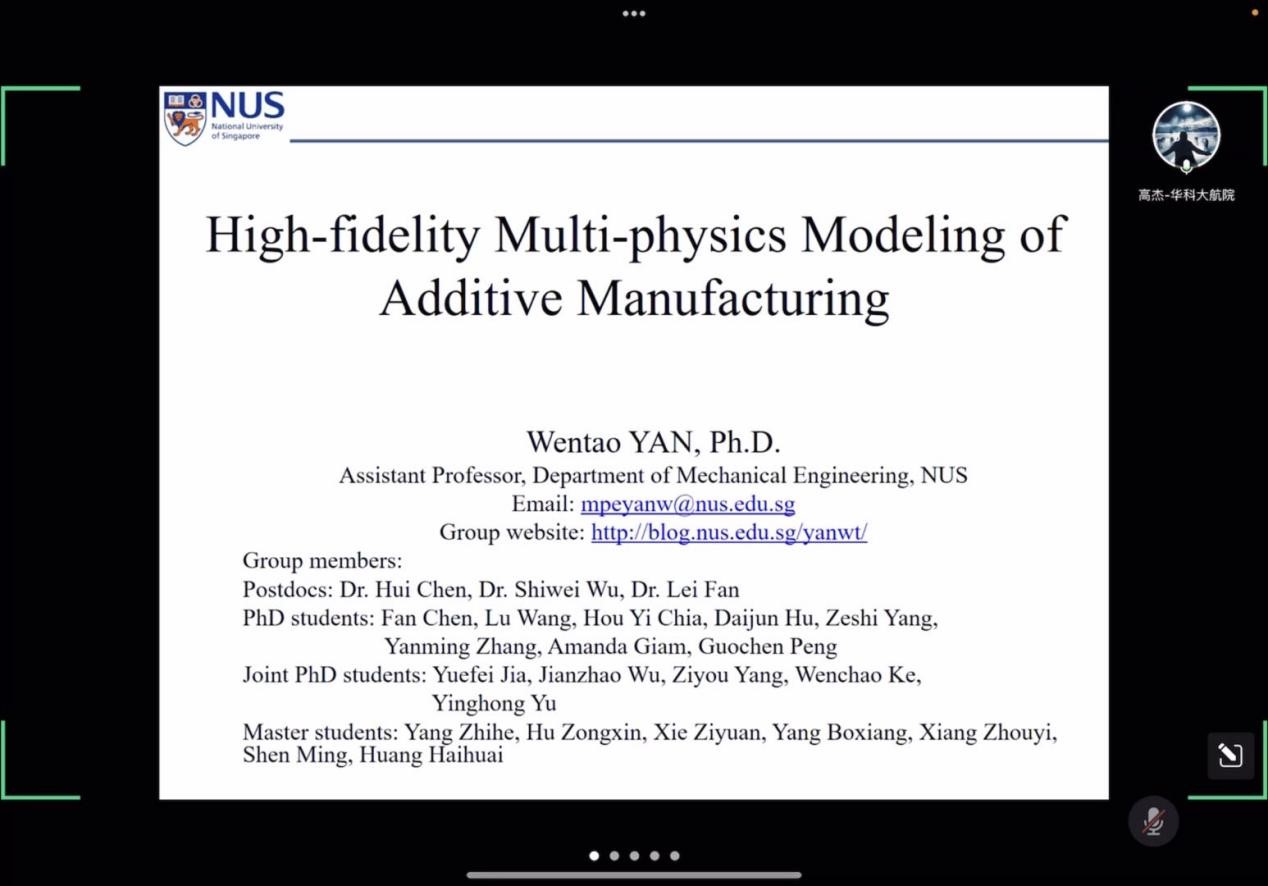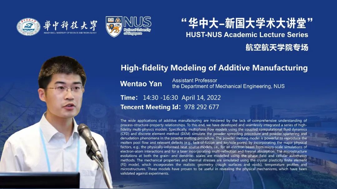 4月14日下午,“华中大-新国大学术大讲堂”系列讲座beats365官方网站专场顺利召开。应beats365官方网站高杰讲师邀请,新加坡国立大学机械工程系闫文韬助理教授作题为“High-fidelity Multi-physics Modeling of Additive Manufacturing”的专题讲座。讲座由高杰讲师主持,140余名来自beats365官方网站、东南大学等国内高校的员工及科研工作者线上参会。