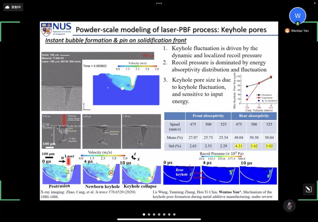 报告中,闫文韬助理教授首先介绍了金属增材制造拥有广阔的应用前景,但由于对其中复杂的物理机理缺乏深入理解、成形质量控制不够稳定等因素而并没有被工业界广泛的采用。其中,针对keyhole(金属蒸发导致的金属熔池表面剧烈波动现象)的仿真模拟一直是技术突破的难点之一。为此,闫文韬团队提出了基于熔池表面的气体流动结构的金属蒸发模型,并将该模型与含有传热、Marangoni现象、Darcy效应等多物理场热流体流动模型结合,还考虑了含蒸发的热流体模型,用以模拟keyhole和熔池流动,辅以X射线试验结果对比验证。