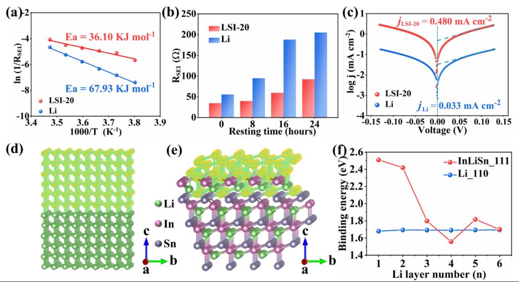 值的比较。(c)LSI-20||LSI-20和Li||Li对称电池的Tafel曲线。(d,e)DFT模拟6层锂吸附在Li(110)(d)和In原子终止的InLiSn(111)(e)基底的模型图。(f)锂原子吸附在Li(110)和In原子终止的InLiSn(111)表面上的结合能随锂沉积层数增加的演变趋势。