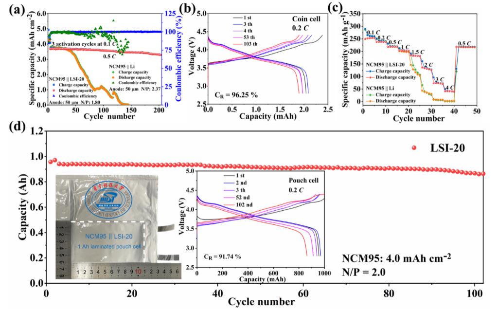 图5.LSI电极在高载量高镍全电池中的电化学性能。(a)NCM95||LSI-20和NCM95||Li纽扣电池在0.5C下的循环性能。(b)NCM95||LSI-20纽扣电池在0.2C下的恒电流充/放电曲线。(c)NCM95||LSI-20和NCM95||Li纽扣电池的倍率性能。(d)NCM95||LSI-20软包电池经0.1C活化两圈后在0.2C下的长循环性能测试,(d)中的插图展示了NCM95||LSI-20叠层软包电池的光学图像和恒电流充/放电曲线。