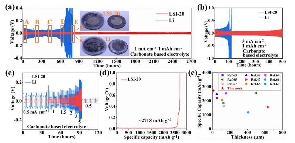 图2.LSI电极在对称电池中的电化学性能。(a,b)LSI-20||LSI-20和Li||Li对称电池在1 mAh cm-2面积容量,1 mA cm-2(a)和3 mA cm-2(b)电流密度下进行恒电流锂剥离/沉积循环的时间-电压曲线。(a)中的插图展示LSI-20||LSI-20和Li||Li对称电池中的LSI-20和Li电极在1 mA cm-2和1 mAh cm-2下循环400次后的形貌。(c)固定容量为1 mAh cm-2的LSI-20||LSI-20和Li||Li对称电池的倍率性能。(d)LSI-20电极的实际比容量。(e)本研究中构建的LSI电极与其他已发表研究中的电极比容量和最小厚度比较。