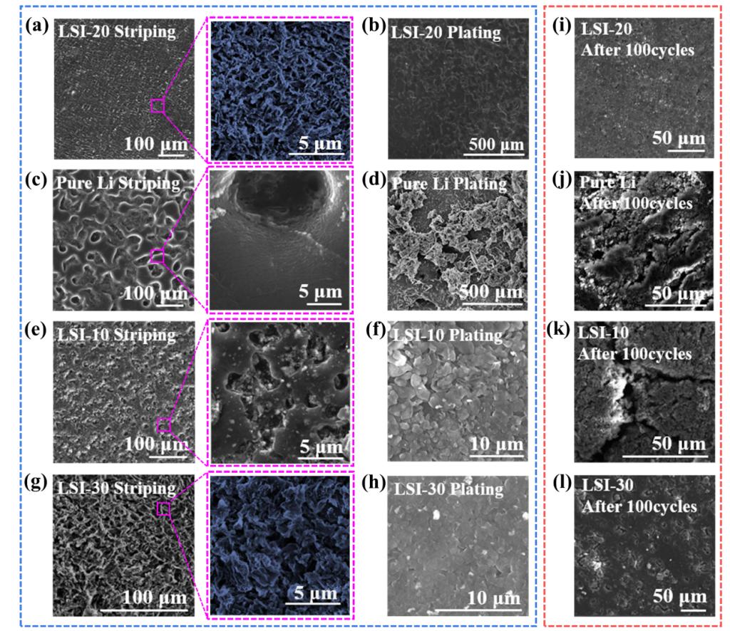 图3.LSI电极的SEM形貌表征。(a-h)LSI-20(a-b)、Li(c-d)、LSI-10(e-f)和LSI-30(g-h)电极在电流密度为1.0 mA cm-2下,Li分别剥离和沉积3 mAh cm-2的SEM图。(i-l)LSI-20(i)、Li(j)、LSI-10(k)和LSI-30(l)在1 mA cm-2和2 mAh cm-2下经过100次循环后的表面SEM图。