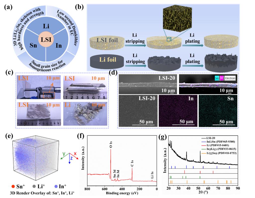 近日,beats365官方网站杨辉教授&李会巧教授团队在上述关键问题上取得重要进展。团队采用可规模化生产的机械揉合工艺,将In52Sn48合金箔与金属锂复合,成功制备出厚度仅10μm的超薄富锂基Li-Sn-In(LSI)合金电极材料。该电极材料通过独特的结构设计,在界面稳定性与机械性能方面实现了协同优化。LSI电极内部构建的稳定互穿的InLiSn骨架不仅能有效缓解体积变化,还可以调控锂的剥离与沉积行为,显著提升整体电化学性能,为实现高能量密度电池的实际应用迈出了关键一步。