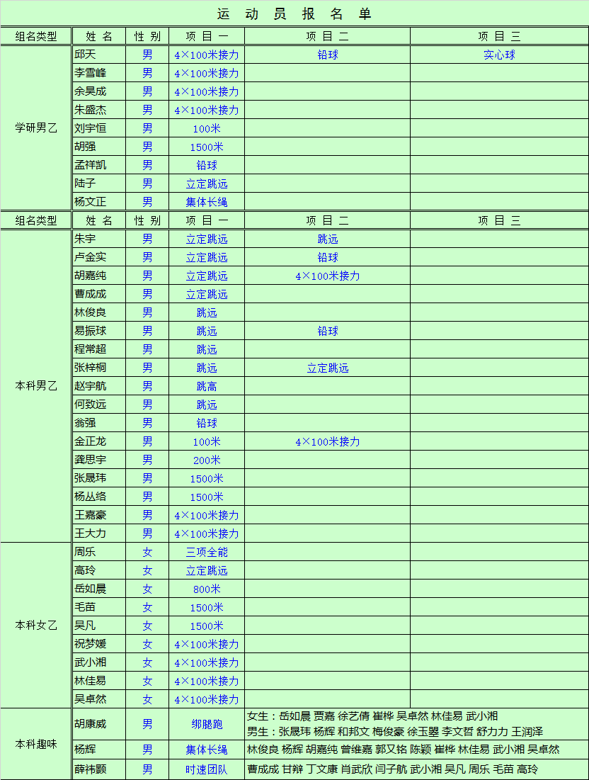 6日下午4*100米接力的压轴大戏中,本科、研究生来自不同专业、不同年级的12名同学分别组成3个男子、女子运动员队伍,驰骋在砖红色的跑道上。金正龙、王嘉豪、王大力、胡嘉纯脚下生风,在本科男乙4*100米接力中取得第八名。学研男乙4*100米接力比赛中,邱天、李雪峰、余昊成、朱盛杰精锐出战,奋力夺得第四名。本科女乙4*100米四人组祝梦媛、武小湘、林佳易、吴卓然取得小组第五名。19级金正龙、20级龚思宇、张晟玮、杨丛络、吴凡分别参加本科男乙100m、200m、1500m、本科女乙1500m,取得了不错成绩。在本科女乙三项全能赛中,18级周乐以立定跳远2.11m、仰卧起坐39个、800米3分07秒的优异成绩夺得第四名。