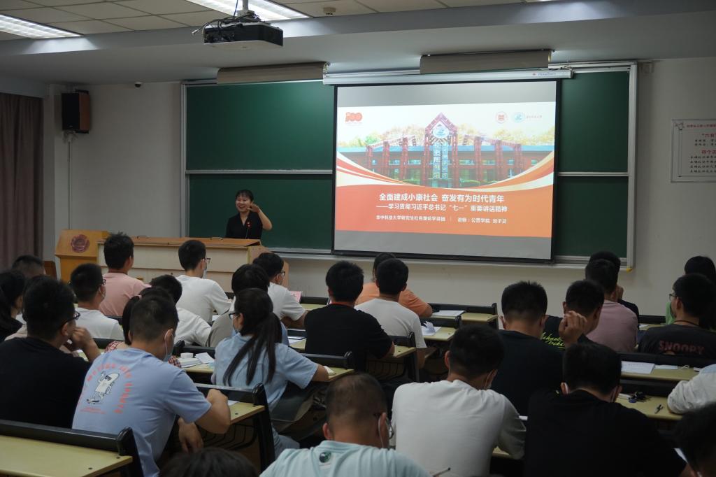 大会还邀请了校资助中心宣讲团的龚慧香同学讲解研究生奖助学金相关政策,帮助新生同学们了解奖助相关内容;校研究生红色理论宣讲团前团长刘子灵同学讲述“全面建成小康社会,奋发有为时代青年——学习贯彻习近平总书记“七一”重要讲话精神”微党课。同学们认真聆听,积极互动,踊跃分享自己对党的认识和感悟心得。