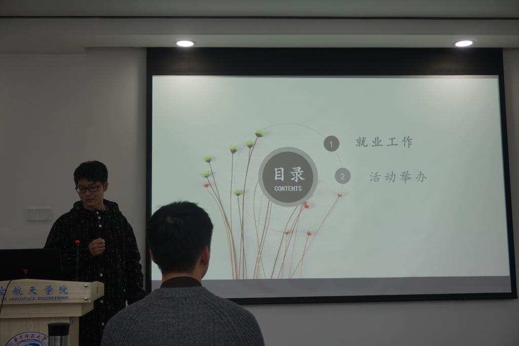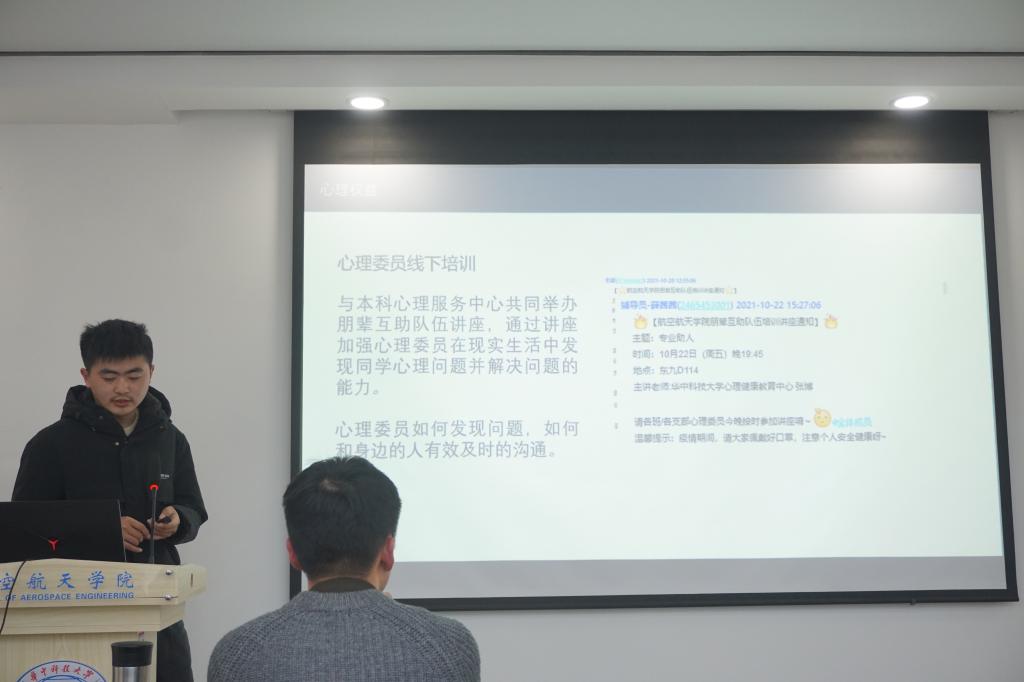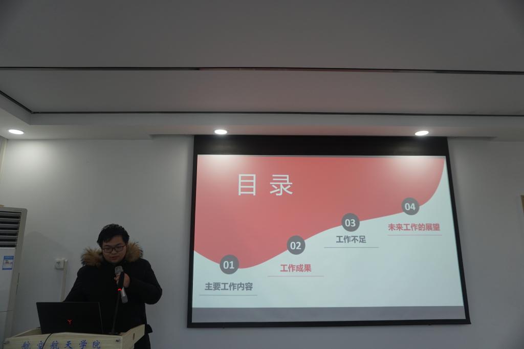 薛茜茜老师对研会工作的成果进行了总结,也对近半年研会工作的不足进行了深刻梳理,从制度执行,日常例会落实,活动举办过程中暴露的问题,以及媒体宣传的方式等都提出了建议,同时希望研会成员在员工工作中要细致耐心,增强与校研会、兄弟院系的联系,优化工作方式,树立航院品牌。