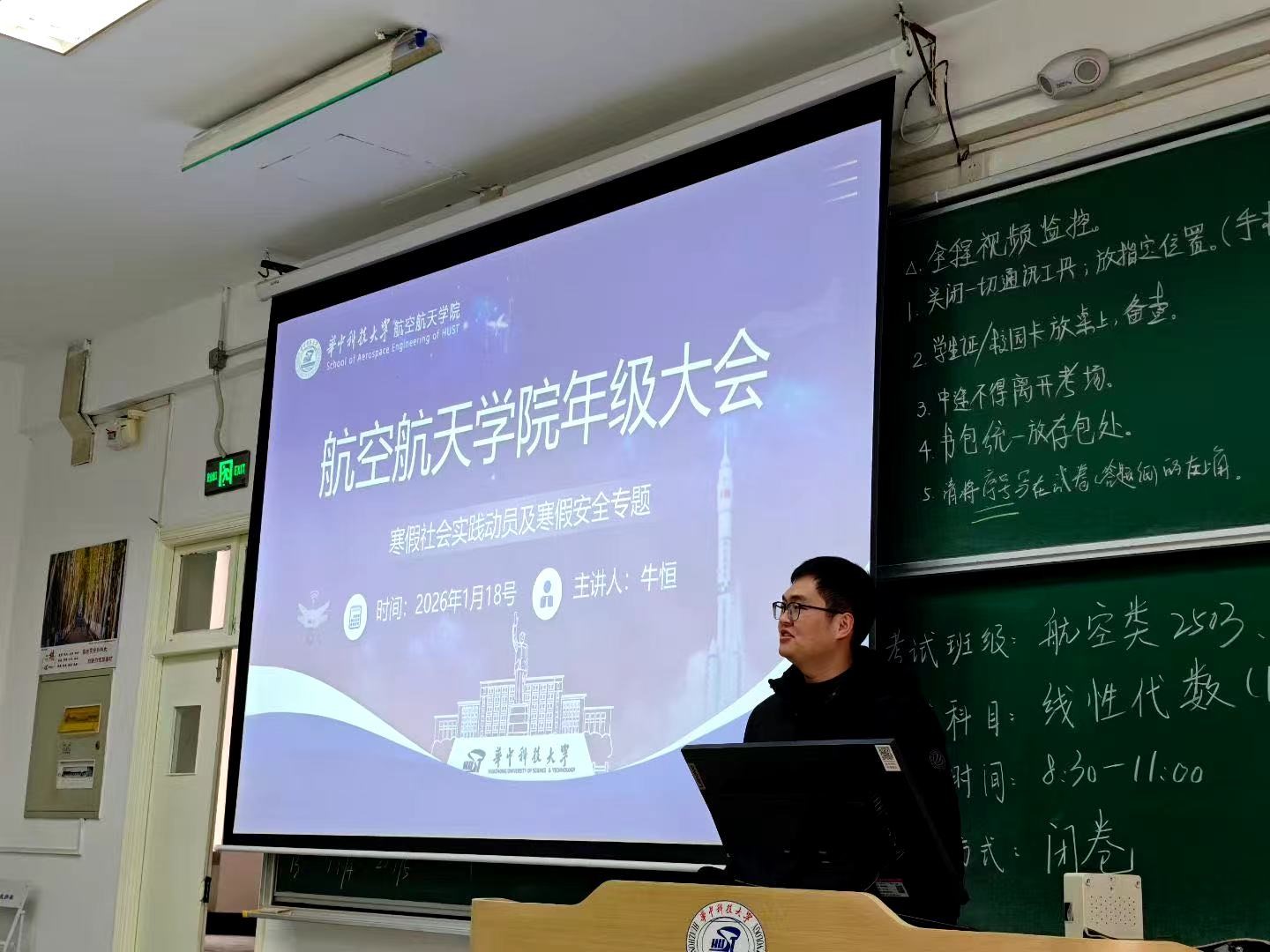 随后,会议进入寒假安全注意事项宣讲环节。牛恒老师围绕离校安全、旅途安全、居家安全、实践安全及网络安全等多个方面,进行了全面、细致的讲解。他重点强调了交通安全、防范诈骗、用电用火安全、防灾避险以及保持健康生活方式等关键问题,通过具体案例提醒同学们务必时刻绷紧安全弦,提高自我保护意识和应急处理能力,确保度过一个平安、健康、愉快的假期。