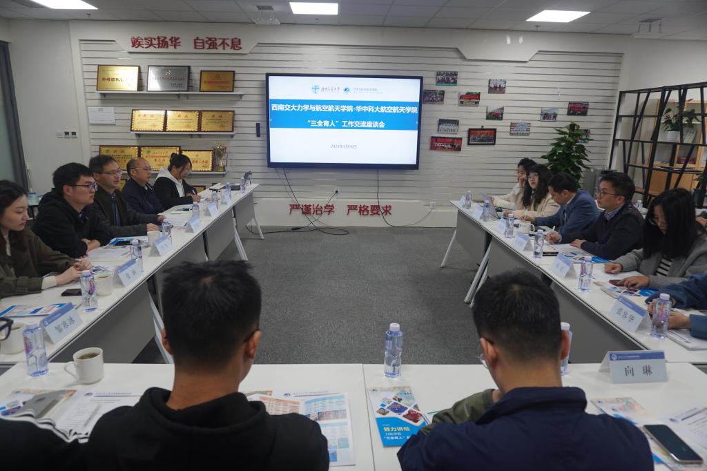 座谈交流中,双方围绕公司发展历程、党建思政教育、团队建设、专业特色、人才培养、科研创新、团队建设、产学研融合等方面展开深入交流与探讨。并结合航空航天专业特色,重点交流了在落实立德树人、强化五育并举、实现“三全育人”实效过程中的优秀经验做法。
