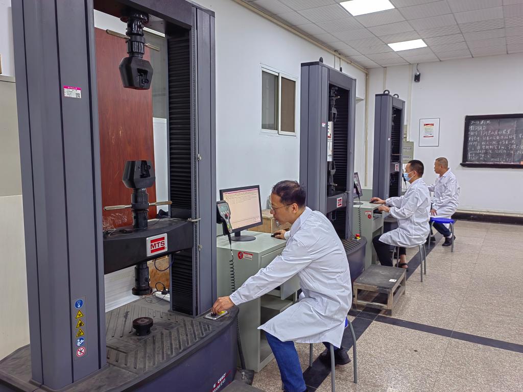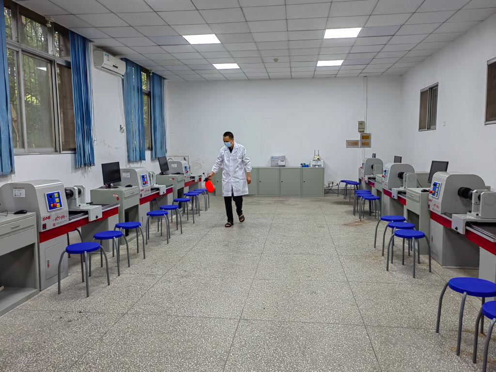 图为基础力学教学中心的老师们在材料扭转强度实验室和材料拉伸强度实验室,进行安全防疫消杀和实验教学设备电子万能试验机的调试。